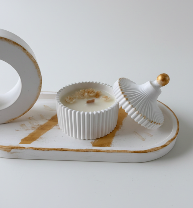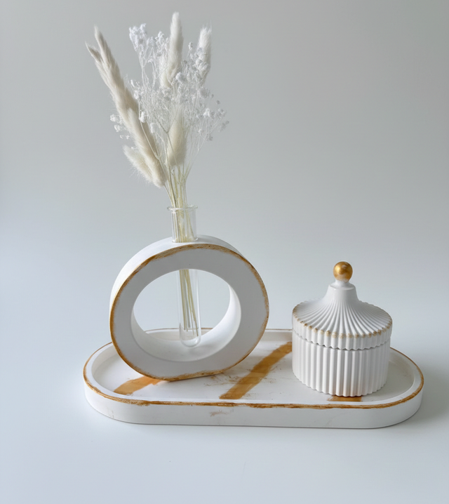 Cet ensemble décoratif élégant, réalisé à la main à partir de poudre de résine, associe harmonieusement un design moderne à des accents naturels. La composition comprend un support décoratif, une bougie coulée à la main décorée de fleurs séchées, ainsi qu’un vase minimaliste pour fleurs, idéal pour embellir les espaces intérieurs.